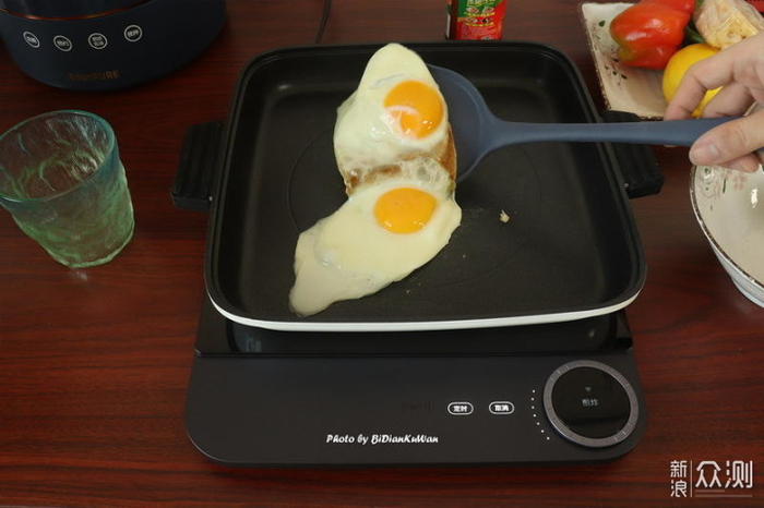 要说我这套电磁炉+锅具最让我舒服的大概就是炒菜不粘了。下图我给大家测试一下“无油煎蛋”,直接在“煎烤”档位,默认“99级”火力下,打入煎蛋2个,半分钟后,可以直接铲起来翻面,烤盘没糊没粘。一个不粘涂层,一个硅胶材质,锅具和铲子都是食品级的,都是知吾煮出品的,放心用就行了。