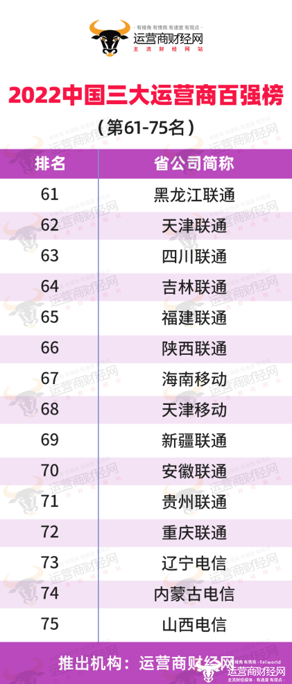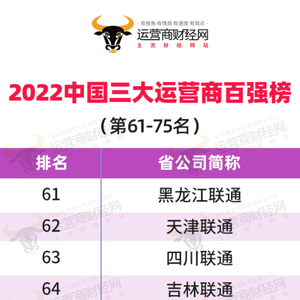 三大运营商省公司收入第61名至75名详情:以中国联通为主占据10家