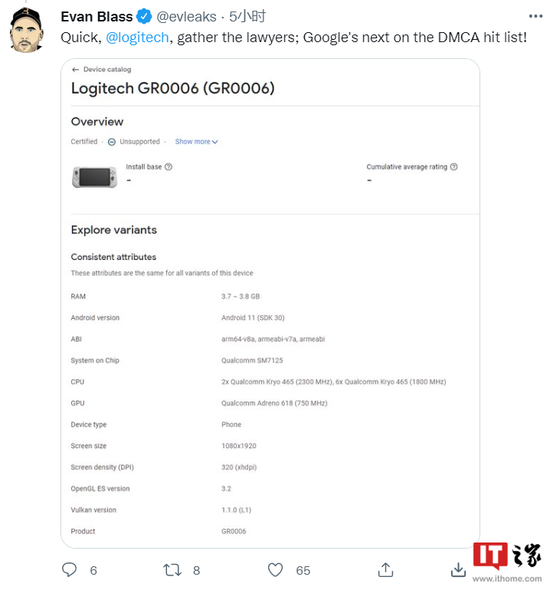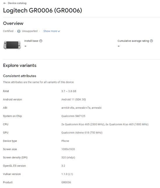 从截图可以看到,这款掌机型号为 Logitech GR0006,也就是以罗技品牌推出,将搭载高通骁龙 SM7125 处理器(骁龙 720G),运行 Android 11,配备 4GB 内存,屏幕分辨率为 1080x1920。