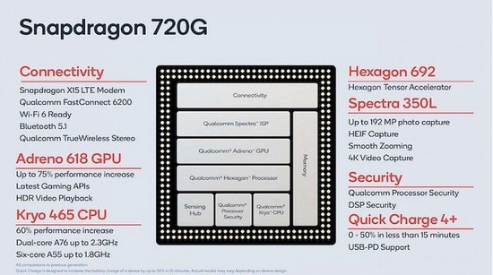 IT之家了解到,骁龙 720G 于 2020 年发布,支持 4G 网,配备 2.3GHz 的双核 A76 + 1.8GHz 的六核 A55,GPU 为 Adreno 618,曾搭载于千元档的 iQOO U1 手机,所以性能就是 2020 年的千元机水平。