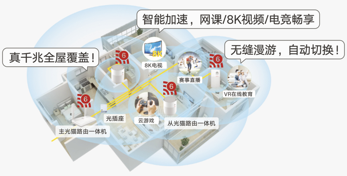 千兆全覆盖,通过光纤+Wi-Fi 6的强强联合,实现端到端无损、全屋无死角的千兆信号覆盖,让家里的每个人在每个时刻、每个地点都能享受“C位”体验;最多可以支持256台终端设备同时上网,是传统组网方式最大连接数的八倍,迎合了当下智能家居的潮流趋势。Wi-Fi全漫游,主从光猫具备智能抗干扰技术和智能漫游技术,让信号“稳如狗”,客厅卧式、楼上楼下任意移动不掉线,切换无感知。