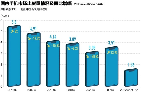 据中国信通院统计,今年上半年,国内市场手机总体出货量为1.36亿部,同比下降超两成。在接受《中国新闻周刊》采访时,中国信通院尚未发布7月国内市场手机出货量数据,长稳咨询董事长王长稳认为,7月数据仍不会乐观。他预测今年国内市场智能手机出货量不会超过2.8亿台,而去年可达3.5亿台。