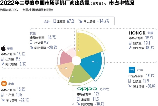 第三方市场调研机构IDC发布的数据显示,2022年上半年,除荣耀外,OPPO、vivo、小米等手机厂商国内出货量呈现程度不同的下滑。OPPO、vivo下滑幅度均超三成,分别从3.71亿台、3.91亿台下滑至2.52亿台、2.62亿台。而荣耀出货量从1.04亿台上升至2.66亿台,更多由于去年上半年其受制于芯片供应,出货量基数较低。