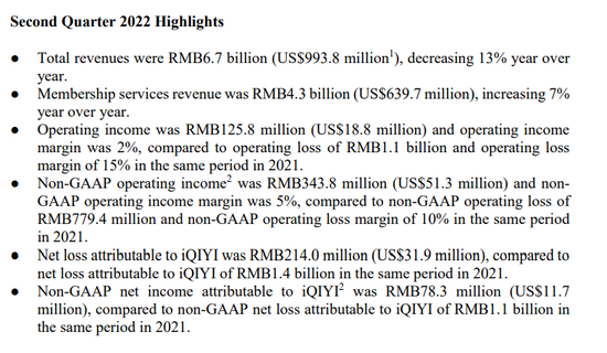 爱奇艺今年一季度首次盈利后,再一次实现单季盈利。