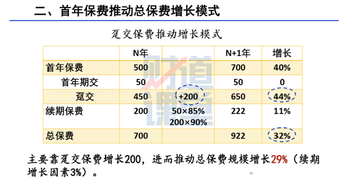 举例说明。上表所列N年的首年保费是250,N+1年也是250,首年保费没有增长。假设N年首年期交保费200在下N+1年度有85%的续保,N年续期保费300在N+1年有90%续保,形成N+1年续期保费440,增长46%,拉动总保费增长25%。