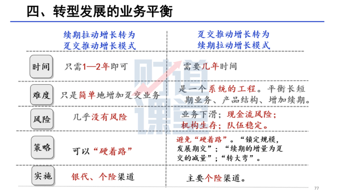 由续期拉动模式转换成趸交推动模式。原来是靠续期拉动总保费增长,现在为了要保费快速发展,转成趸交推动模式,短期内业绩会明显提升,也没有现金流风险。所以,这种转型一般很容易,也没有什么风险。