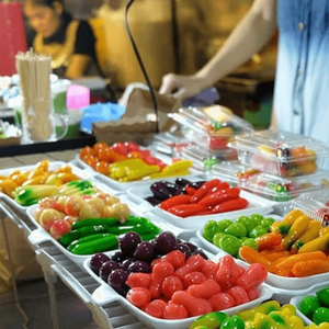 作为曾经的“皇室御膳”,这种源自泰国的甜点,有着鲜艳的色彩和仿照各种水果捏制出的精致造型,让人忍不住想象它晶莹剔透的外表下,究竟会有怎样可口的味道。对于让露楚成功走红的市集摊主们来说,它又像一个趣味挑战,在捕获消费者的同时,获得前所未有的关注。