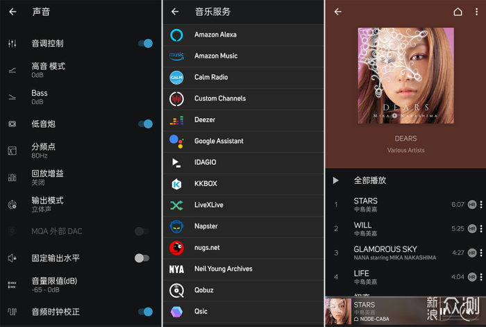 通过专属的BluOS APP可以看到,对于Bluesound NODE无线数字播放器的输出是可以自行调节的,例如高低音调整、分频点、回放增益、音量限值、输出模式等。而音乐服务方面,也支持各类国外主流音乐服务。