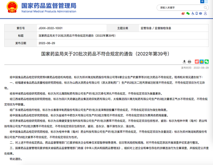 2020年7月,海南省药品监督管理局网站发布“关于2020年第七期(总第五十八期)药品抽查检验信息通告”显示,太极集团四川绵阳制药有限公司等2家企业的2批次药品抽检不合格。