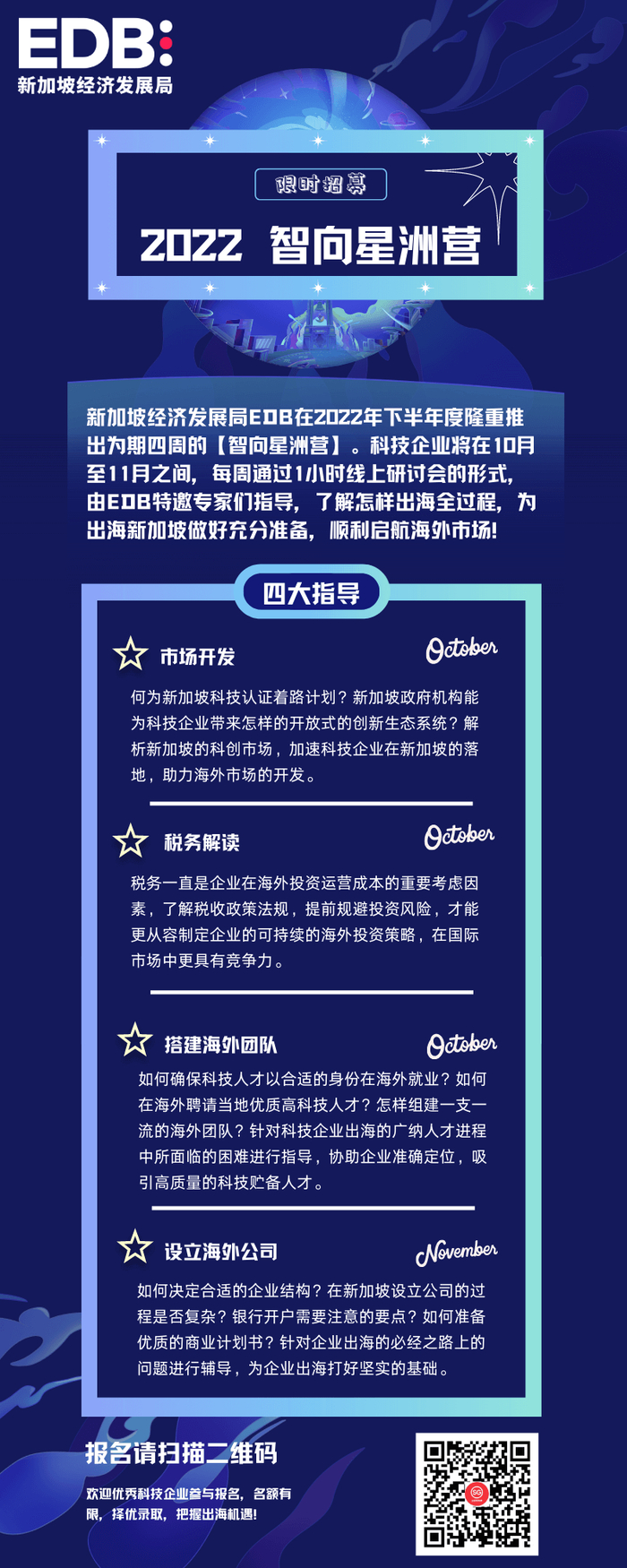 除了今天的交流会,新加坡经济发展局EDB还将在2022年下半年隆重推出面向科技企业的为期四周的【2022智向星洲营】,特邀专家们为企业出海辅导,协助企业做好出海新加坡的准备。