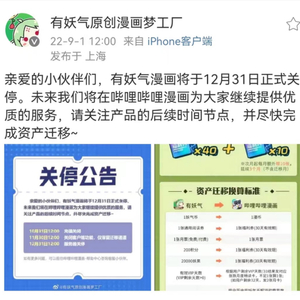 9月1日,有妖气漫画官方微博发布公告称,有妖气漫画于12月31日正式关停后,未来将在哔哩哔哩漫画继续提供服务。同时,有妖气漫画官方提醒用户关注产品的后续时间节点,并尽快完成资产迁移。