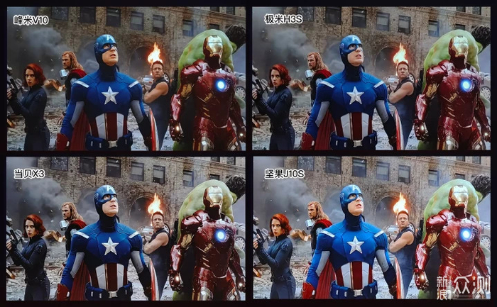 播放《复仇者联盟》峰米V10 4K的优势还是比较明显的,清晰度更高、细节更丰富,场景的氛围感也是四台机器中最强的;极米H3S和当贝X3的显示效果比较接近;坚果J10S的对比度5000:1-8000:1是四台机器中最高的,所以画面明显比其他三台机器亮了一级,不过绿巨人的肌肉、钢铁侠的盔甲包括整个场景的氛围这些细节却少了一分漫威电影标志性的质感。