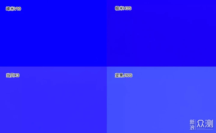 关于纯色显示的对比,参考下图,视觉差异还是挺明显的,纯蓝色的显示被峰米V10拿捏的死死的。