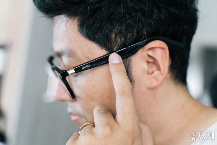 再来对比一下普通的光学眼镜,对比之下,看不出GetD格多维智能音频眼镜有什么不一样的地方,和一个普通光学眼镜一样。最明显的差别就是单独对比眼镜腿时,可以看出GetD格多维智能音频眼镜的眼镜腿更粗一些,而普通光学眼镜的眼镜腿更轻薄一些。GetD智能音频眼镜重量为46克,在眼镜里算是比较重的了,对比普通的光学眼镜,差不多重量多了将近一倍。