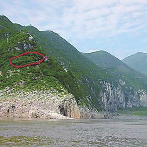 ▼瞿塘峡西口的老关庙遗址(红圈处)