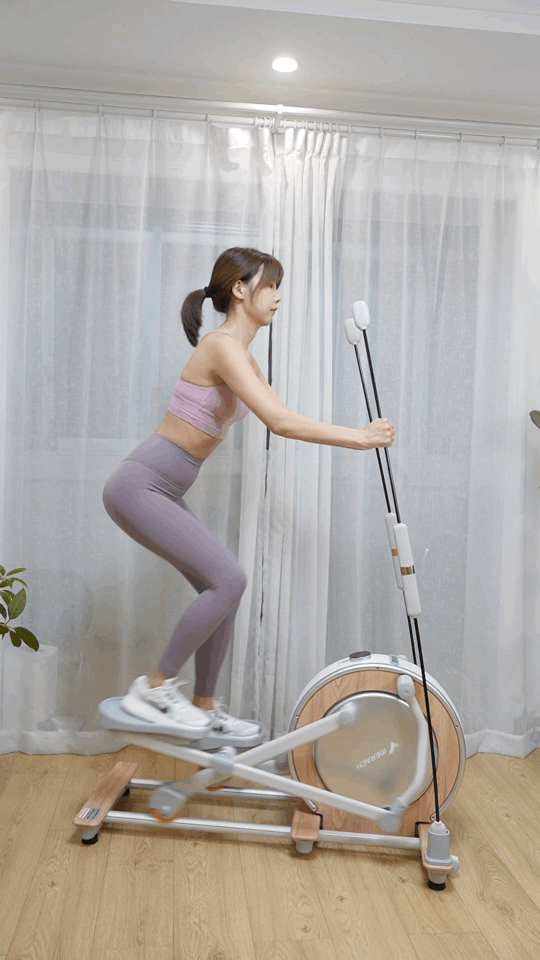 ▼运动过程中可以把手自然的放置在把手上,与肩保持同一高度,双手跟着下半身的节奏自然推动把手,让整个半身也参与到协同运动中来。