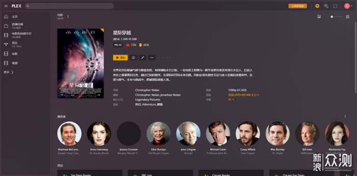 可以看到Plex拥有非常好看的海报墙,且拥有非常详细的影片刮削,打开单个电影 ,也可以看到刮削的信息十分完整,包括电影简介,演员列表,大众评论,音轨格式,竟然还有相关电影推荐。