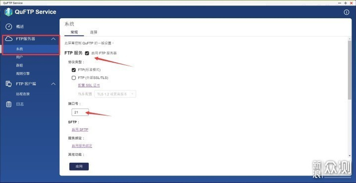 安装完QuFTP应用后,点击进入,在FTP服务器——系统设置中,启用FTP服务器,并且记住端口号21。