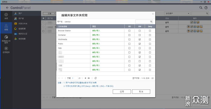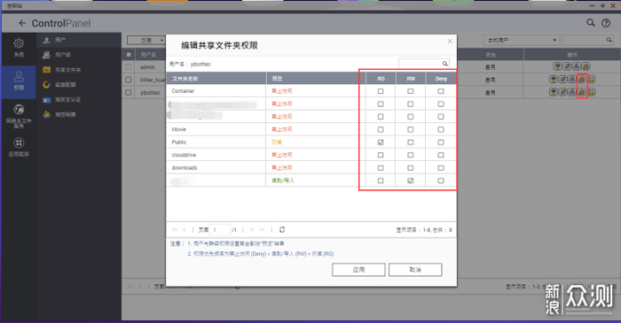 而且,威联通还支持每个成员的权限管理,包括有对应用、文件夹的访问、读写与修改等权限都可以设置。