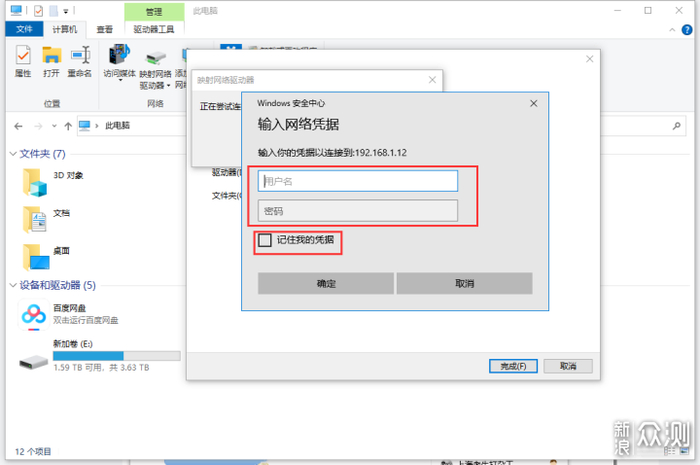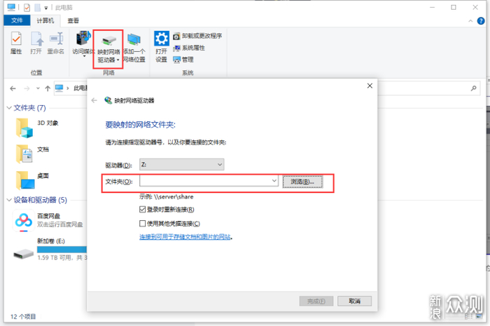 接着打开电脑,点击 此电脑,在上方的计算机选项中选择映射网络驱动器。在弹出的设置框中,在文件夹选项中输入\\ip地址\对应的文件夹,然后再点击完成。