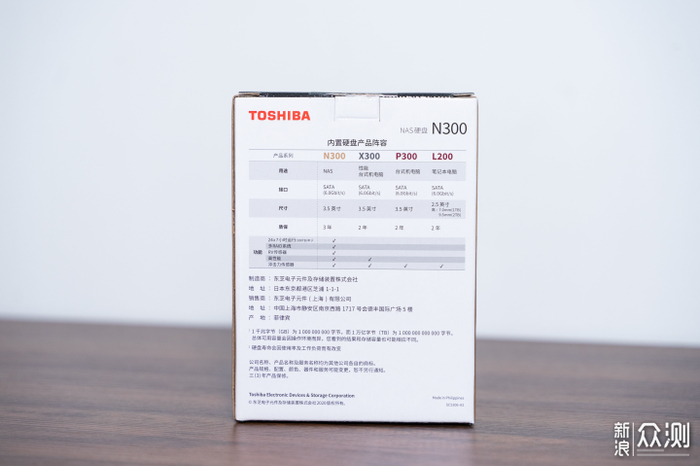 从外盒背面的东芝系列硬盘对比表可以看出,我手中的这款东芝N300 NAS硬盘的平均无故障时间(MTTF)为100 万小时,3 年有限质保,这也很不错。