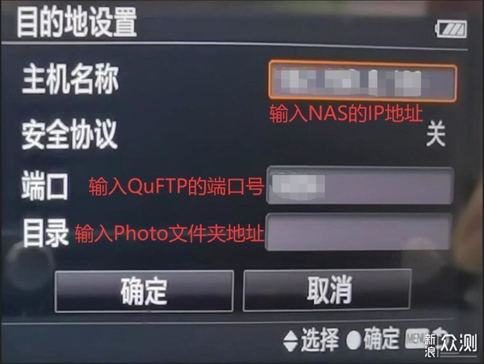 根据相机上的提示来输入NAS的IP地址和端口号,由于我们之前在NAS上创建了Photo文件夹,所以目录这一栏输入/Photo,接着点击确定。