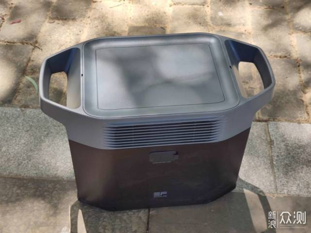 德DELTA 2户外电源两侧设计有两个空心把手就像人的两只耳朵,把手非常牢固而且都做了倒角处理便于双手平稳端起。一侧外壳上面有两个散热风扇孔下面印有英文logo。另外一侧外壳上面有栅栏式的散热孔和一个带盖子的加电包连接孔,整体非常简约时尚。