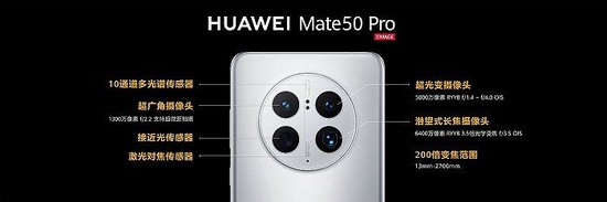 其中,华为Mate 50包括5000万像素超广变镜头、1300万像素超广角镜头、1200万像素潜望式长焦镜头,支持100倍变焦;Mate50 Pro潜望式长焦镜头升级6400万像素,变焦范围达200倍。