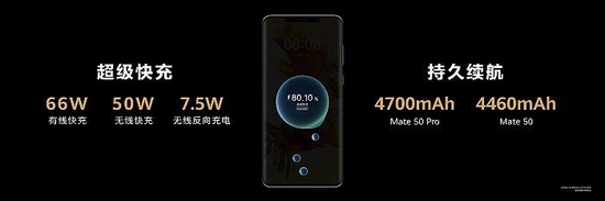 续航方面,华为Mate50系列搭载66W有线快充和50W无线快充。此外,当手机电量低于1%时,可启动“聚能泵”,满足低功耗应用的应急使用。在不损伤电池寿命的前提下,支持待机3小时,或通话12分钟,或亮码10次,或扫码4次。