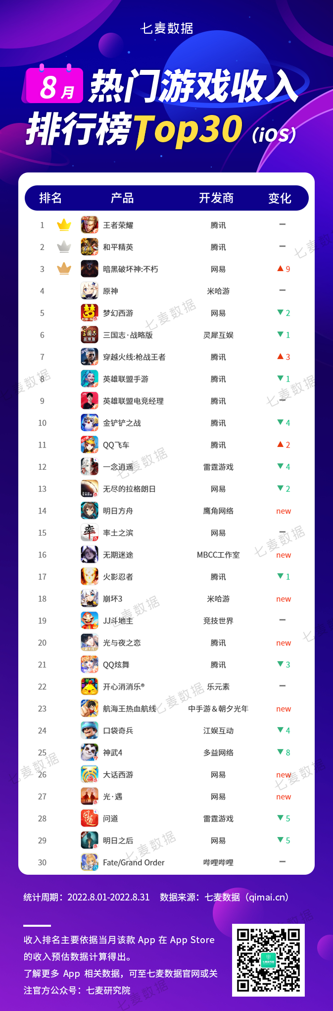 近日,七麦数据发布了 2022 年 8 月热门游戏排行榜,包含游戏下载榜和游戏收入榜。随着开学季的临近,暑期档也迎来了下半场,8 月手游又有什么值得关注的,我们一起来看看吧~