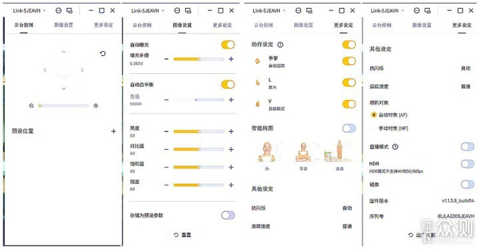 相较于市面大部分具有人形追踪的智能摄像头,Insta360 Link这款摄像头的功能更加全面,而针对丰富的特色功能,其也专门配备了客户端insta 360 Link Controller来进行各种模式的调配。客户端对于各种功能的分布很清晰,视频预览、画质选择、截屏、手动控制方向/变焦、更改图像设置参数、HDR、镜像画面、还支持自动白平衡、自动曝光等功能,同时也能自己调节色温、亮度、对比度、饱和度以及锐度等参数,操作非常简单智能模式切换以及三轴云台的角度(横拍、竖拍、俯拍微调等)调整,初次上手智能摄像头的玩家,基本上都能轻易上手,很友好。