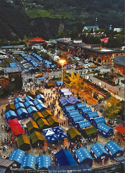 9月5日18时20分,天色渐暗,甘孜藏族自治州泸定县磨西镇临时安置点亮起了震后的第一盏灯。王明峰 汤 卫摄影报道