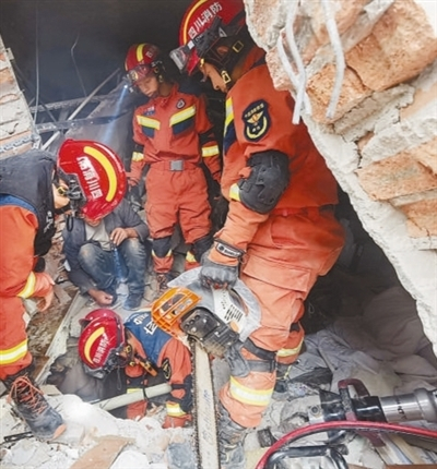 9月5日17时16分,海螺沟景区消防救援大队对位于磨西镇老街一酒店二楼的被困群众展开营救。消防救援人员破拆加固建筑废墟、安全评估现场环境,并对废墟中的障碍物进行清理,经过紧张救援,被困群众被成功救出。王明峰 刘国谦摄影报道