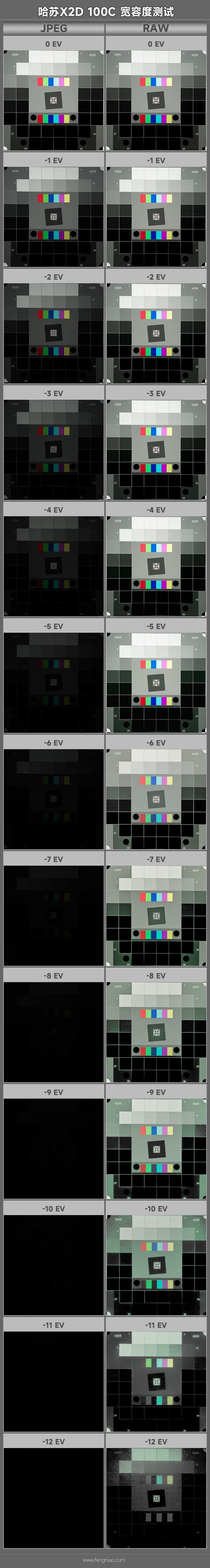 测试时,我们使用哈苏X2D机身配合XCD 2,5/55V镜头,拍摄了背照式测试灯箱。固定光圈与感光度,通过调整快门速度改变曝光量,测试图左侧为JPEG实拍截图,右侧为RAW图片进行欠曝和过曝的同等级回拉。
