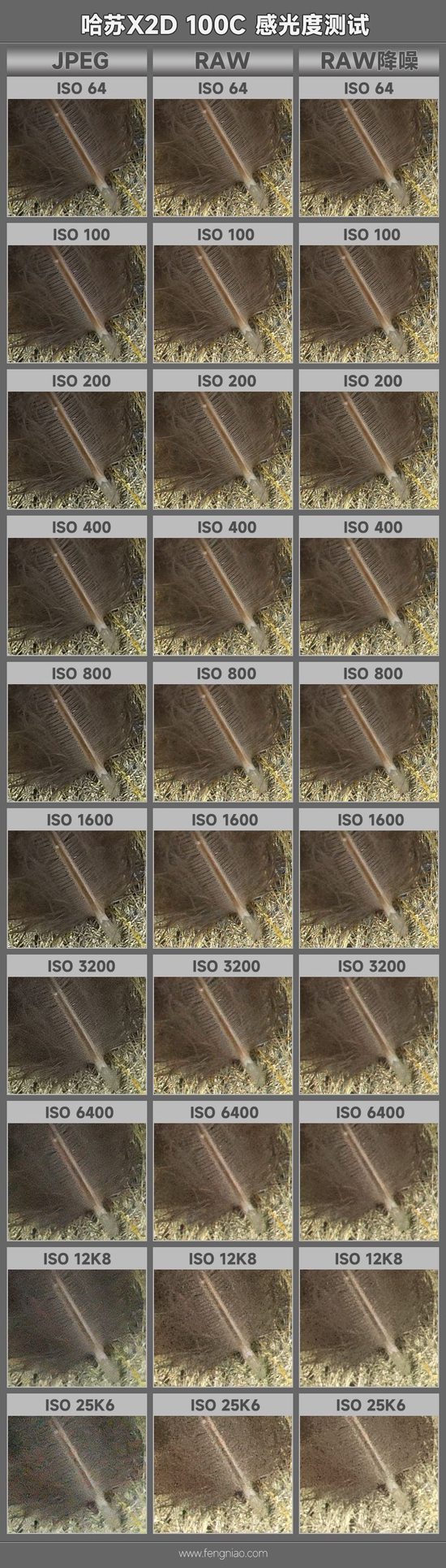 职业摄影师手中的中画幅相机,拍摄的题材多数都是商业题材,要么是棚内人像、静物,要么是建筑或者风光居多,在这些题材下,高感光度往往很少会用到,高感光度的效果也就没有低感光度的价值大。哈苏X2D此次在感光度上下探增加了ISO64,对于静物和棚内拍摄的用户来说,还是非常需要的一个功能。此外的常规感光度与前两代产品保持一致,最高为ISO25600。常规来说,高感光度并不是中画幅相机擅长的测试项,即使是像素不很高的中画幅相机,在面对高感光度时依旧极富挑战。我们在棚内拍摄静物箱(灯光照度800Lux),采用JPEG、RAW以及RAW降噪处理的三种展示方式,表现这款相机在各挡感光度下的实拍能力。
