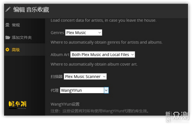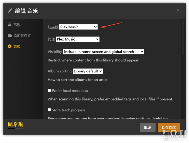 ▼高级选项这里选择扫描器,默认只有 Plex Music .