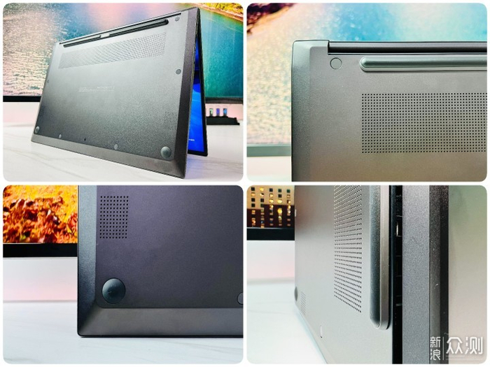 LG Ultra笔记本底部的两侧是双向扬声器,我听了一下音质的提升还是比较明显的。上方一整条是散热系统的进风口,出风口则位于转轴处,这点跟MacBook的散热设计是如出一辙的。