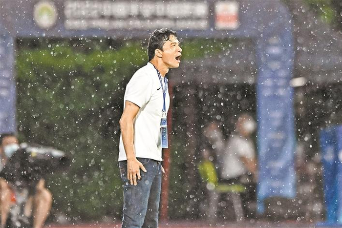 6月16日,海口,大连人队主教练谢晖在中超联赛中指挥。新华社发