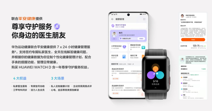 除了让用户更便捷地主动管理健康,当他们遇到一些身体上的「麻烦」,华为也能提供后续的服务。比如,华为运动健康联合平安健康,为华为穿戴用户提供线上专业健康服务“尊享守护服务”,包含私家医生服务、三甲专科问诊、专家挂号协助服务(就医绿色通道)、活力人生会员权益四大守护服务。不仅提供线上专业健康问诊,支持一对一私家医生24小时在线问诊、三甲医院专科医生问诊以及协助挂号服务。用户可通过华为运动健康App签约私家医生,解答健康问题、解读各类健康报告、制定健康计划,让华为WATCH D实现从健康监测到问诊就医的完整健康管理模式,长期、稳定地关注自身健康状况。
