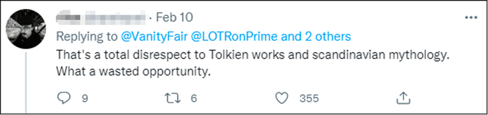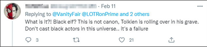 「这根本就是对托尔金作品和斯堪的纳维亚神话的不尊重,白白浪费大好机会。」、「托尔金的棺材板都要压不住了。黑人演员不应该出现在中土世界」...... 在社交媒体关于指环王相关的讨论下,这种观点并不少见。