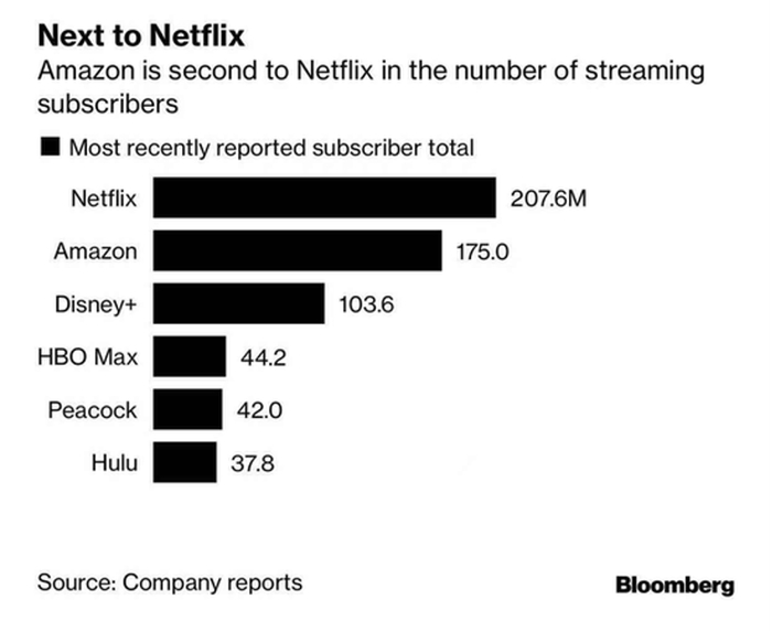 亚马逊已经是订阅数第二的流媒体平台|Bloomberg
