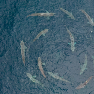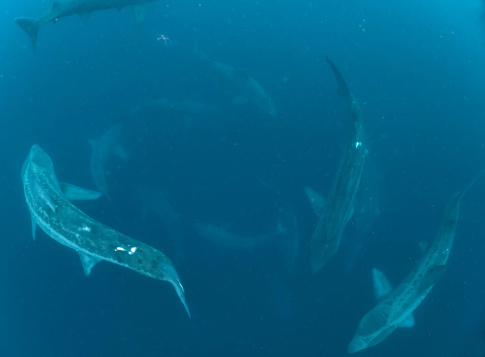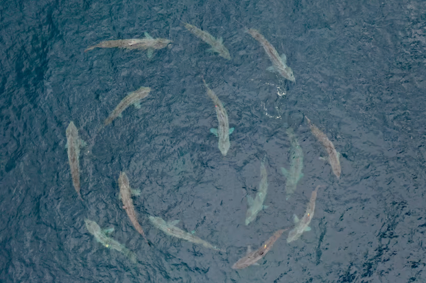 以前,人们并不完全了解这些“聚会”的目的。为了找到答案,来自爱尔兰姥鲨小组和英格兰海洋生物协会的科学家们使用水下摄像机和空中无人机研究爱尔兰克莱尔郡海岸的姥鲨种群。从2016年到2021年,研究人员在该地区的九个地点共记录了19个“盘旋群”。每个群体中的鲨鱼数量从6到23头不等。