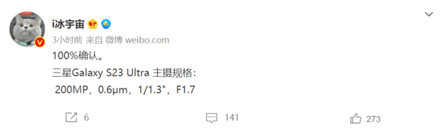 今日,数码博主@i 冰宇宙爆料称,已确认三星Galaxy S23 Ultra主摄规格。其表示,三星 Galaxy S23 Ultra采用 2 亿像素(200MP)图像传感器,拥有 0.6 微米(μm)像素、1/1.3“ 大底、F1.7 光圈。
