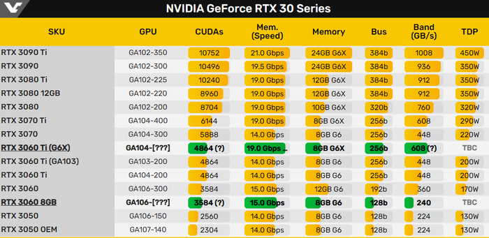 此外,英伟达还在更新配备 GDDR6X 显存的 RTX 3060 Ti,假设它具有与 RTX 3070 Ti 相同的 19 Gbps 显存,那么带宽将从 448 GB / s 增加到 608 GB / s(增加 36%)。