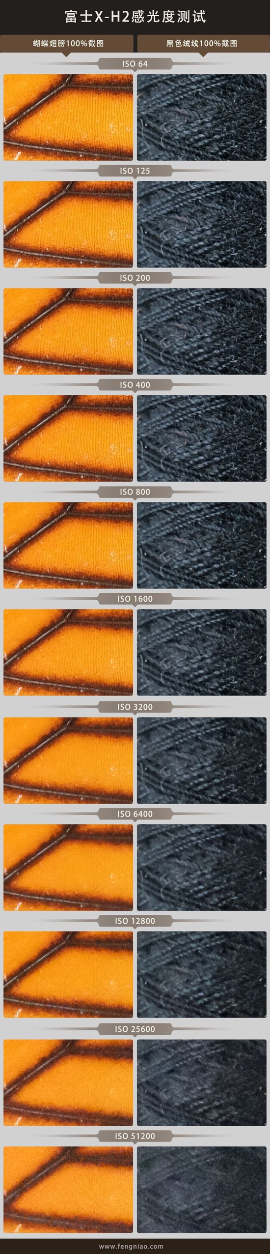 接下来我们看看富士X-H2的感光度表现,富士X-H2的传感器和此前的富士X-H2S并不是一个类型,它采用了约4020万像素背照式“X-Trans CMOS 5 HR”传感器和高速“X-Processor 5”处理器,原生感光度范围为ISO 125-25600,可以向上以及向下扩展(最低ISO 64,最高ISO 52100)。本次测试我将机内长时间曝光降噪调整为关闭,逐级调整感光度数值并保持曝光一致、RAW+JPEG双格式记录的方式,目前因为RAW格式文件还无法解开,所以以下为100%放大的JPEG截图区域。