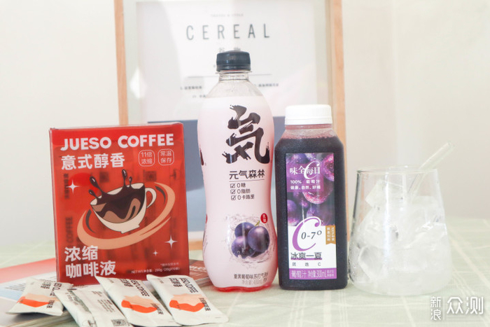 所需材料:元气森林葡萄、味全葡萄、冷萃咖啡、冰块