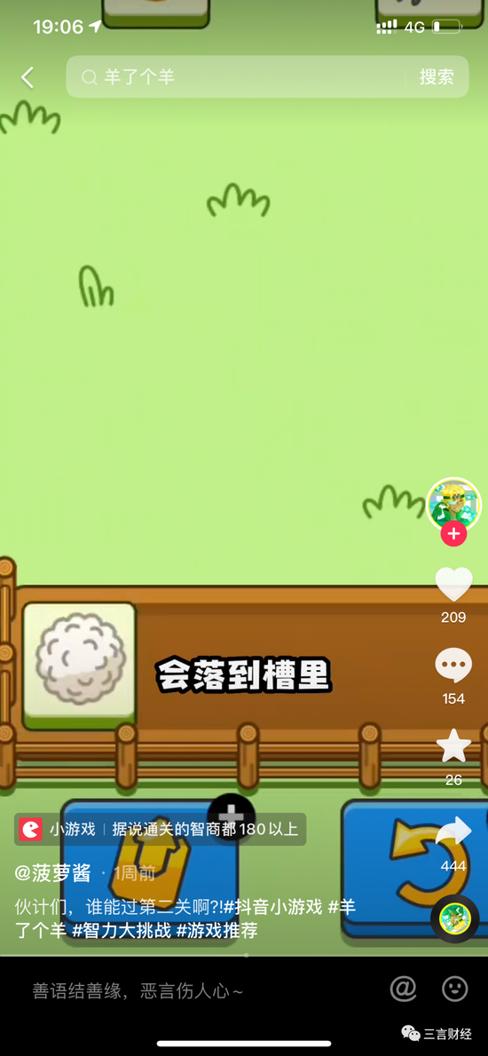 果不其然,三言财经发现, 在短视频平台上,至少在一周前就有游戏博主发布了《羊了个羊》第二关的游戏视频,并且在视频下方还挂了游戏链接。