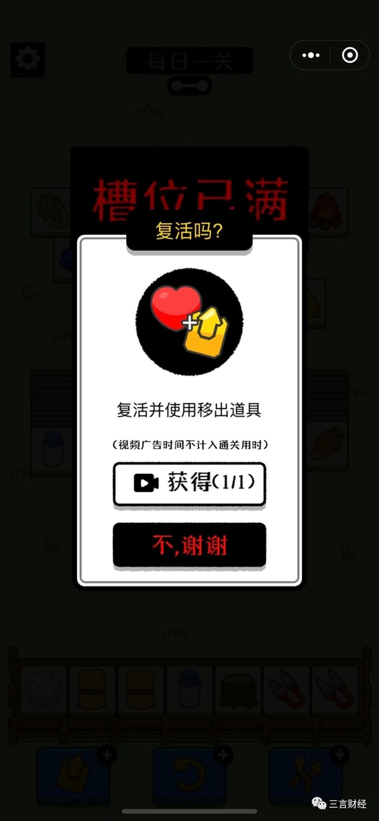 那么为了努力尝试通关,玩家们不得不通过看广告、分享好友链接等方式获得更多游戏次数;然而, 现实是大部分玩家想尽办法都仍然无法通过第二关。有玩家向三言吐槽称,自己身边的“广告战神”都被这游戏折磨的要死要活;还有网友表示,玩这个游戏看的广告比自己一年看的还多。