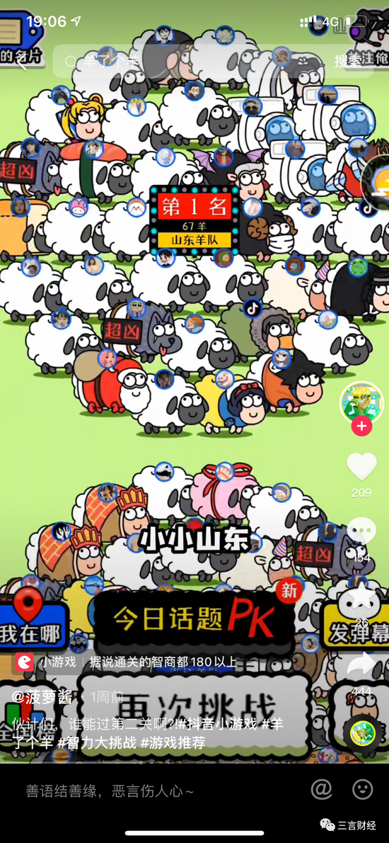 随着《羊了个羊》热度暴涨,目前短视频平台上相关视频非常多,还有专门的通关挑战榜。但三言财经仔细梳理了大部分内容发现,整件事营销痕迹还是挺明显的。