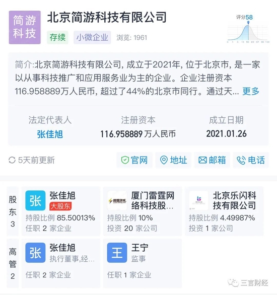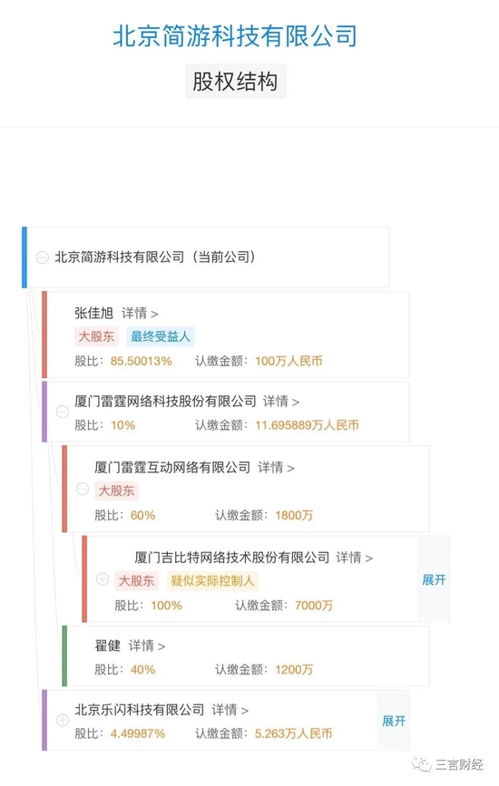 简游共有三名股东,其中,大股东为张佳旭,持股85.5%;另外两名股东为厦门雷霆网络科技股份有限公司和北京乐闪科技有限公司,分别持股10%和4.5%。